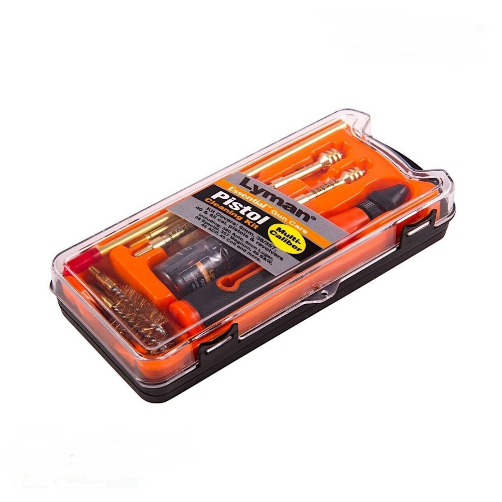 Covers 380 Auto, 9mm Luger, 38 Special, 357 Magnum, 40 S&W, 45 ACP and 45 Colt calibers. The handle features a rotating attachment point for the rod, which allows the rod to rotate and follow the rifling in your barrel. All the components are packed in a convenient plastic carrying case.