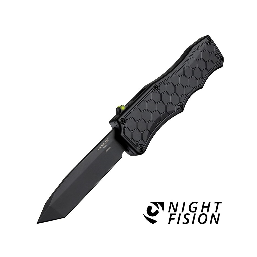 EXPLOIT OTF AUTOMATIC 3.5 inch TANTO BLADE - BLACK PVD, MATTE BLACK ALUMINUM FRAME - TRITIUM INFUSED TRIGGER