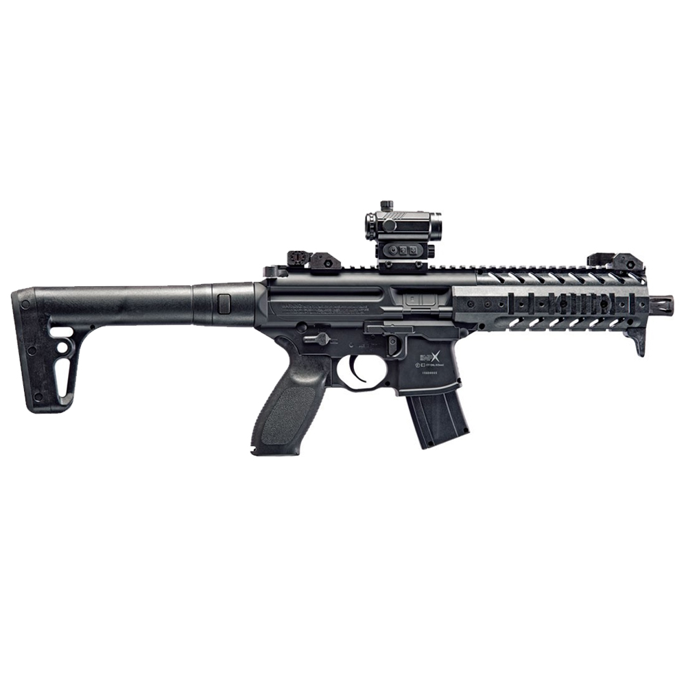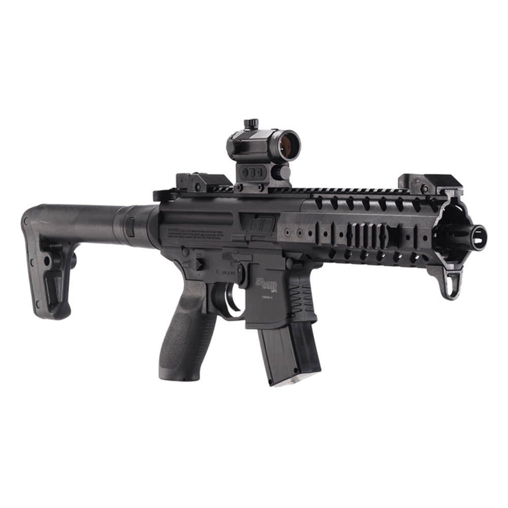 The SIG MPX redefined modern pistol caliber SBRs, and this Air Rifle version does no less for CO2 rifles. Matched to original model weight, balance and controls, the SIG MPX Air Rifle airgun puts more accurate performance into more accessible practice. Chambered in .177 pellet, features include 8" rifled steel barrel, synthetic handguard, picatinny rail, tactical front grip, Micro Red Dot Sight, flip-up front and rear sights. *Results may vary based on ammo weight, temperature, and altitude.