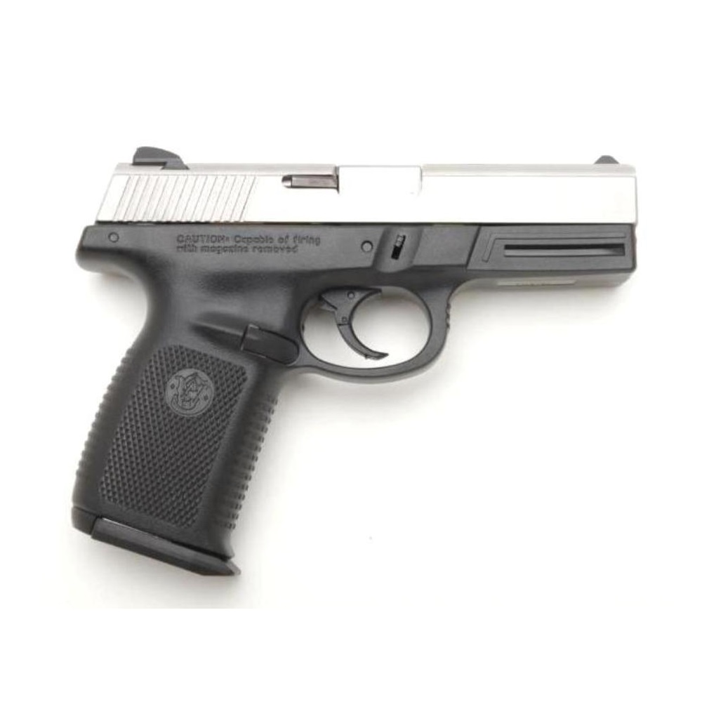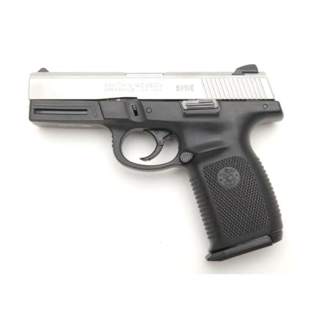 This is a Smith & Wesson Model SW9VE, one of the S&W Sigma series pistols. The Sigma was Smith & Wessons first venture into using synthetic materials in gun construction, using high-strength polymer material for the frame. The gun is similar to a Glock safe-action pistol in both its design and operation. This pistol is chambered in 9mm and features a 4-inch barrel, polymer frame, and stainless steel slide.