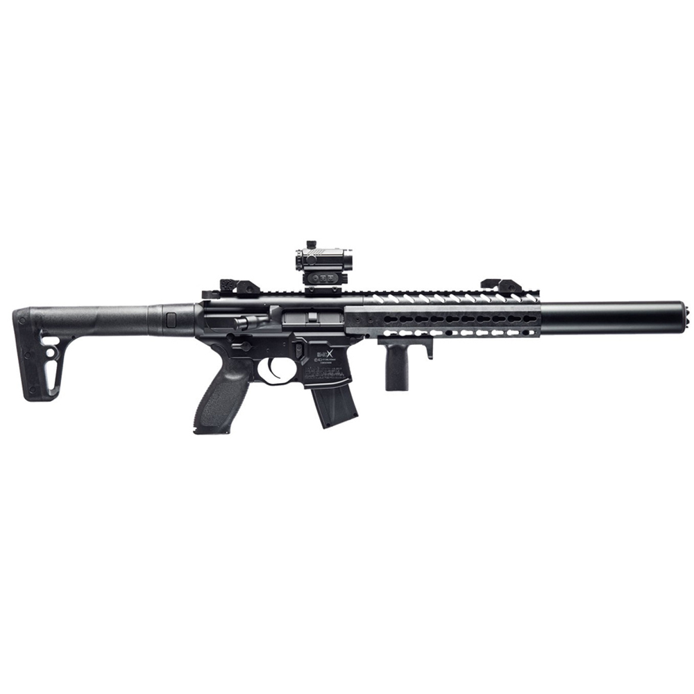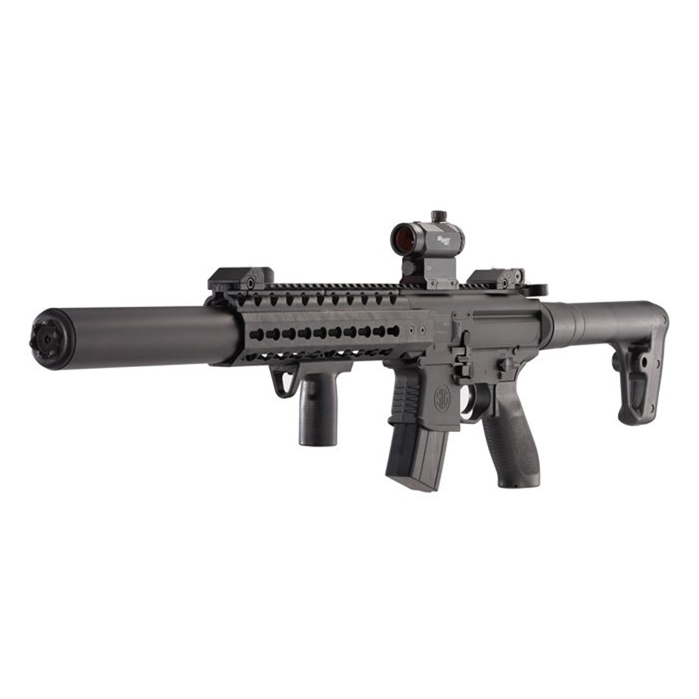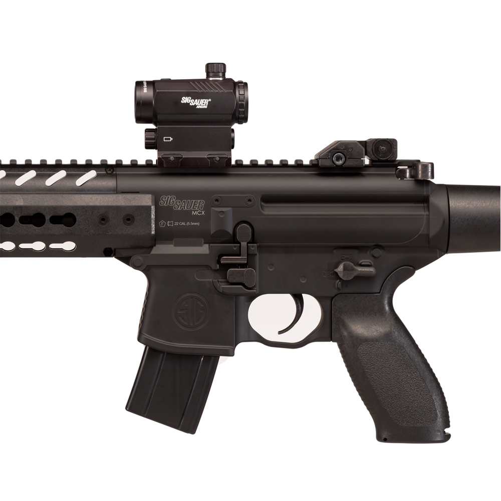 From tactical drills to target practice, the CO2 powered SIG MCX Air Rifle delivers 30 rounds of rapid-firing, simulated SIG MCX performance and handling for more realistic, economical training and practice — any time, any place. Chambered in .177 pellet, features include an 18" rifled steel barrel, synthetic handguard, picatinny rail, tactical front grip, Micro Red Dot Sight, flip-up front and rear sights and more.