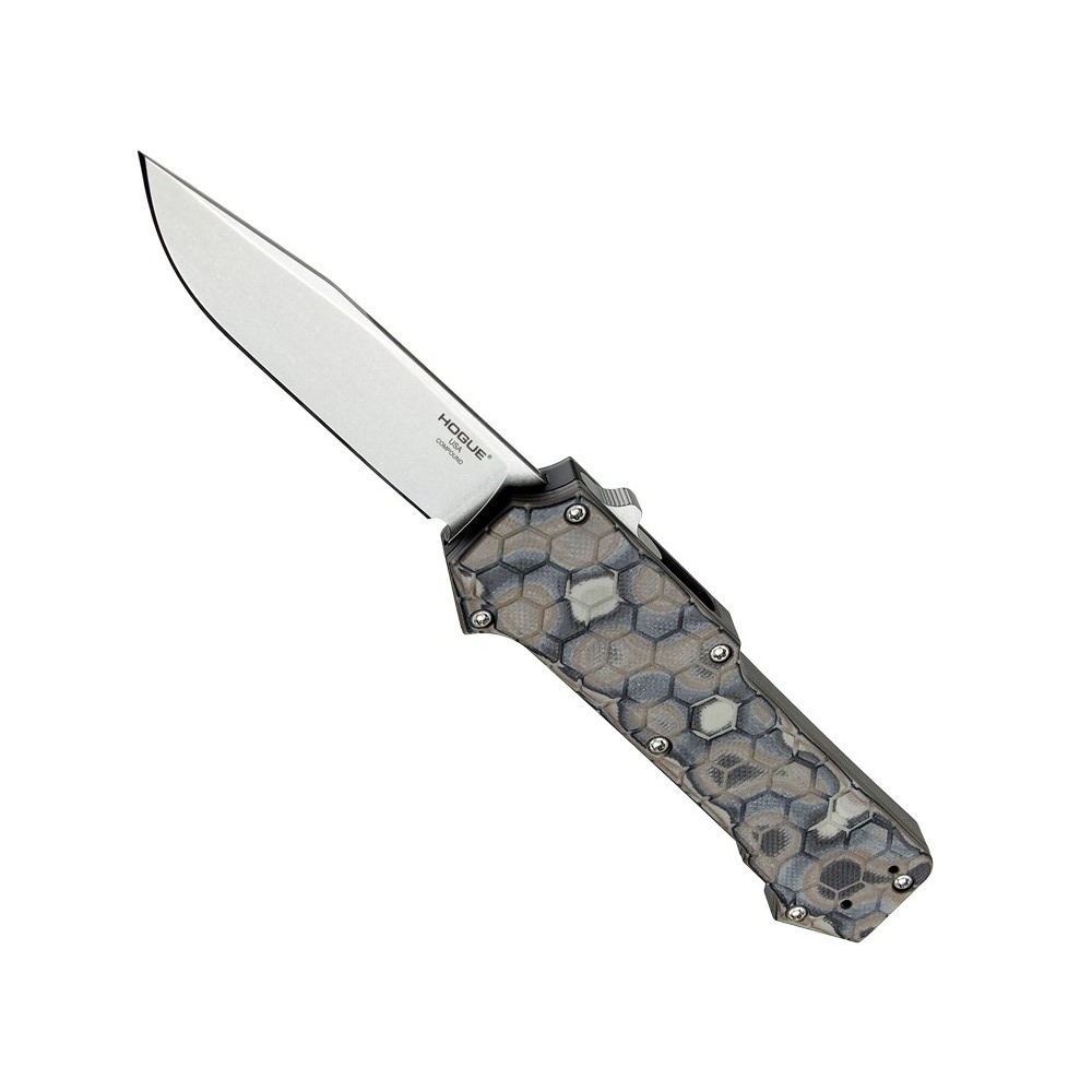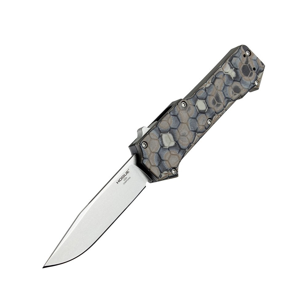 COMPOUND OTF AUTOMATIC 3.5 inch CLIP POINT BLADE - TUMBLED FINISH, G-MASCUS DARK EARTH G10 FRAME