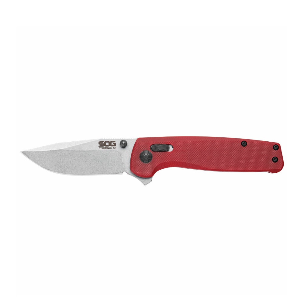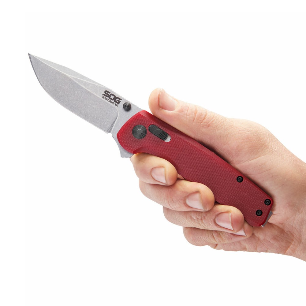 For those looking for something a little more rugged, theres Terminus XR G10. Stripped, back, straightforward, clad with an honest G10 handle and stone washed hardware. The XR locking mechanism is snappy and adjusts over lifespan of the knife. The D2 steel blade features high toughness and wear resistance. The knife is fully ambidextrous, with swappable belt clip for left or right wear. Three different opening methods: thumb stud, XR Lock, and kick. The Terminus XR is setting a new bar for EDC.