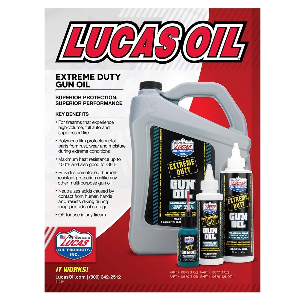 Lucas Extreme Duty Gun Oil is a special blend of oil and petroleum-extracted additives producing a lubrication specially formulated for high volume, high heat and friction firearms.