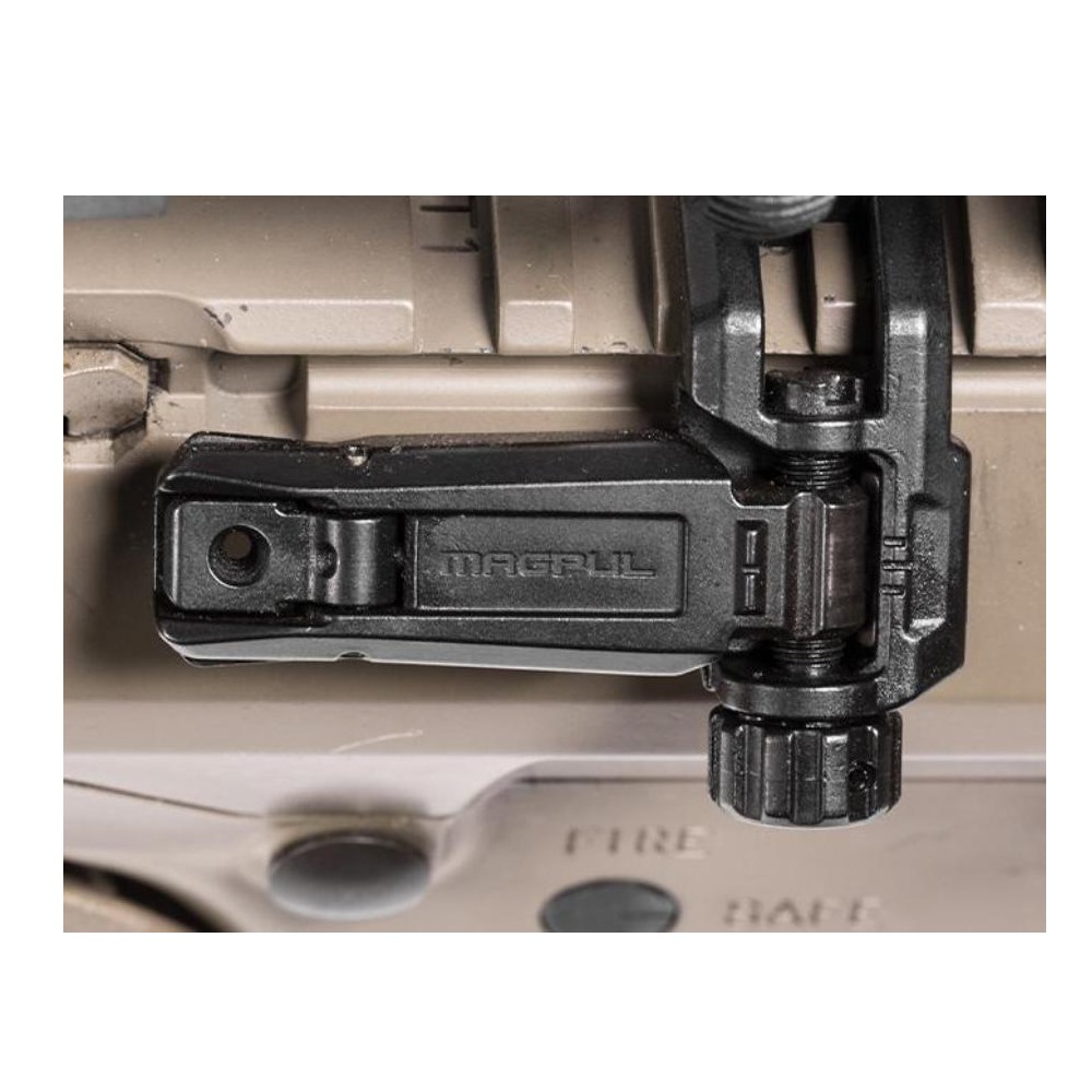 The MBUS Pro Offset Rear Sight features durable Melonited steel construction, positive detented lockup when deployed, tool-less windage adjustment for easy zeroing, dual rear apertures, and a low profile footprint to ensure compatibility and reduce interference with most rifle setups.