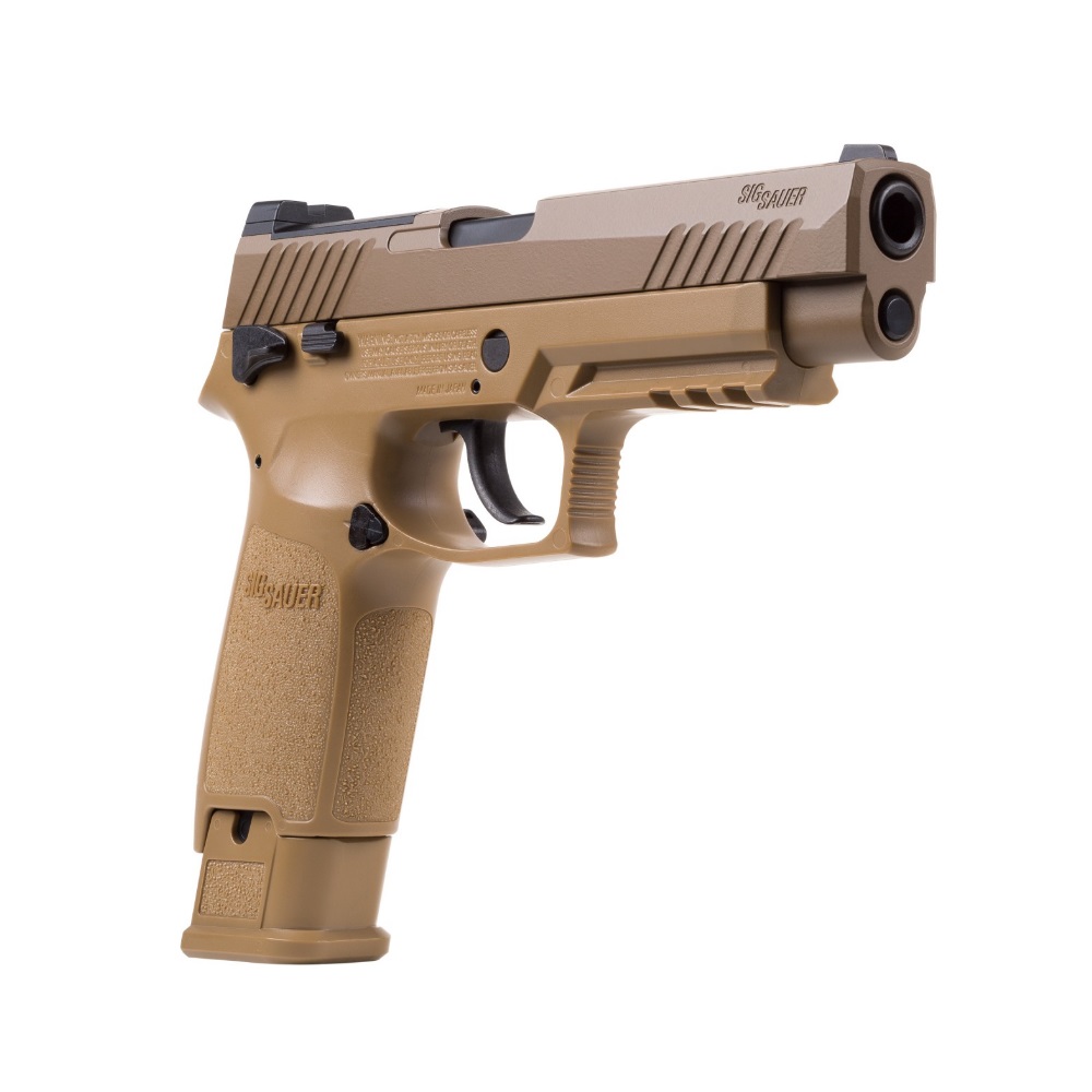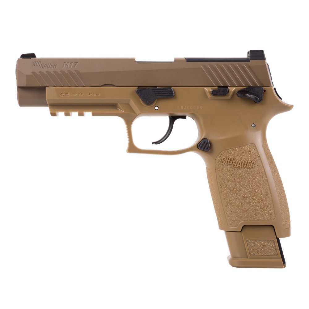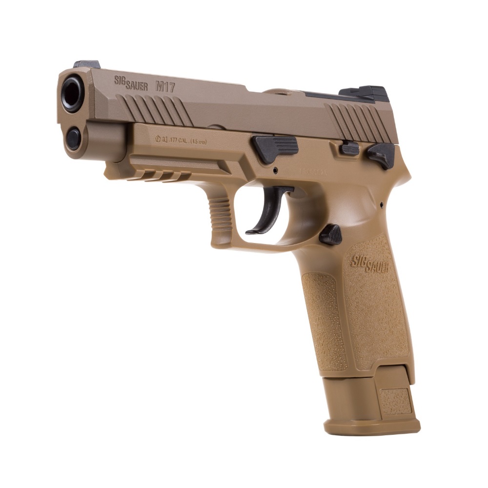 The Sig Sauer P320-M17 CO2 Powered Air Pistol lets you train with a CO2 replica of the semi-automatic pistol that was chosen by the US military for the new US service pistol–the M17. The P320-M17 air pistol is chambered for .177 pellets and has a 20-round pellet magazine. The metal slide utilizes a blowback action to cycle pellets into the chamber and CO2 power propels the pellets up to 430 fps. The pistol features open sights and the polymer frame has a built-in Picatinny rail for attaching aftermarket laser sights or tactical lights. The Sig Sauer P320-M17 CO2 Powered Air Pistol is an authentic, economical way to train both indoors and outdoors. CO2 and pellets sold separately.