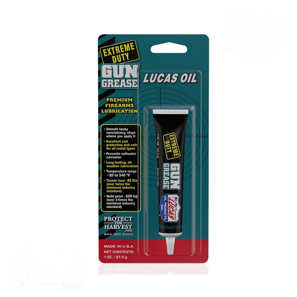 Application to metal surfaces and bores will prevent corrosion during long term storage. Lucas Extreme Duty Gun Grease withstands extreme pressures and cushions metal surfaces with an 80 LB Timken load (35 LB is the minimum industry standard). Lucas Oil Extreme Duty Gun Grease is recommended for all firearm types. It provides excellent lubrication and protection on shotguns, pistols and revolvers as well as full auto carbines, rifles and belt.