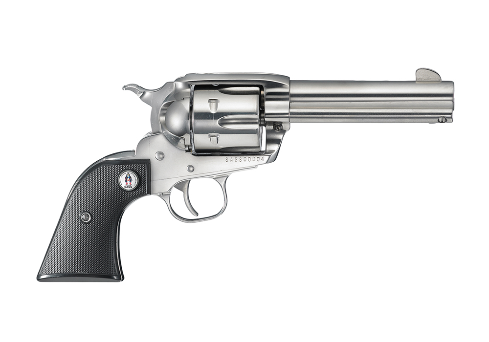 Traditional western-style, hand-filling grip has long been acknowledged as one of the most comfortable and natural-pointing of any grip style. Patented reverse indexing pawl allows for easier loading and unloading, while the traditional beveled cylinder simplifies holstering. Transfer bar mechanism and loading gate interlock provide an unparalleled measure of security against accidental discharge. Handsome, larger crescent-shaped ejector rod head boasts traditional form, perfect for every cowboy or cowgirl. Cold hammer-forged barrel results in ultra-precise rifling that provides exceptional accuracy and longevity. Blade front and integral notch rear sights. Models chambered in .357 Magnum also accept factory .38 Special cartridges. Montado-style hammer. Black, checkered grips with SASS® logo. Consecutive serial numbers with "SASS" prefix, shipped together in commemorative case.