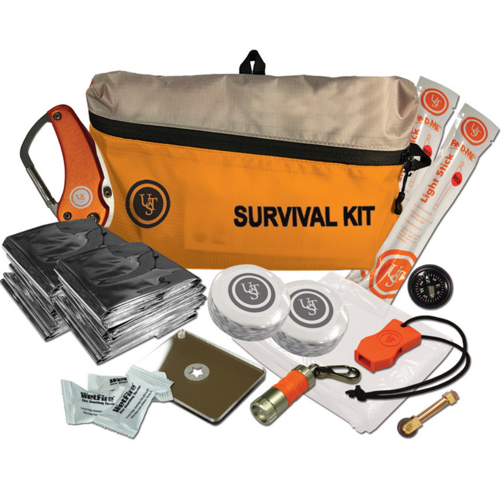 You can always be prepared. The UST Feather Lite™ Survival Kits contain an assortment of essential supplies you may need in an emergency including: 1pc Button Compass, 2pcs Emergency Blankets, 2pcs Emergency Ponchos, 1pc JetScream™ Micro Whistle, 1pc Klipp™ Biner Knife, 2pcs Find-Me™ Light Sticks, 1pc MoonForce™ LR41, 1pc Micro SparkWheel™, 1pc StarFlash® Micro Mirror, 1pc Survival Towels and 1pc WetFire™ Cubes stored inside a lightweight, compact orange pouch for convenient storage. Perfect at home, in your car, on your boat, and in your pack. Height:5.50 x Width:8.00 x Depth:1.80 inches. Weight: 368 grams.