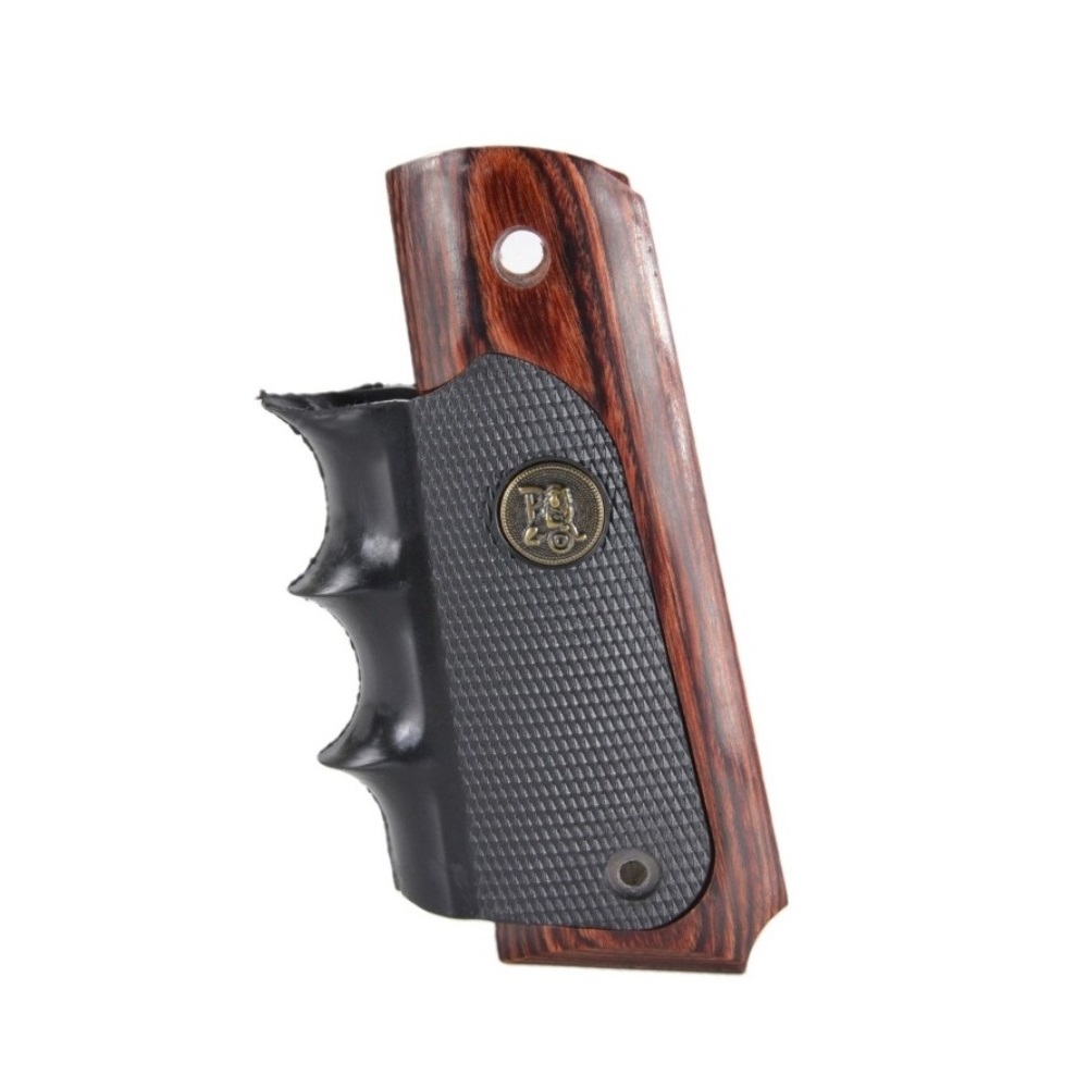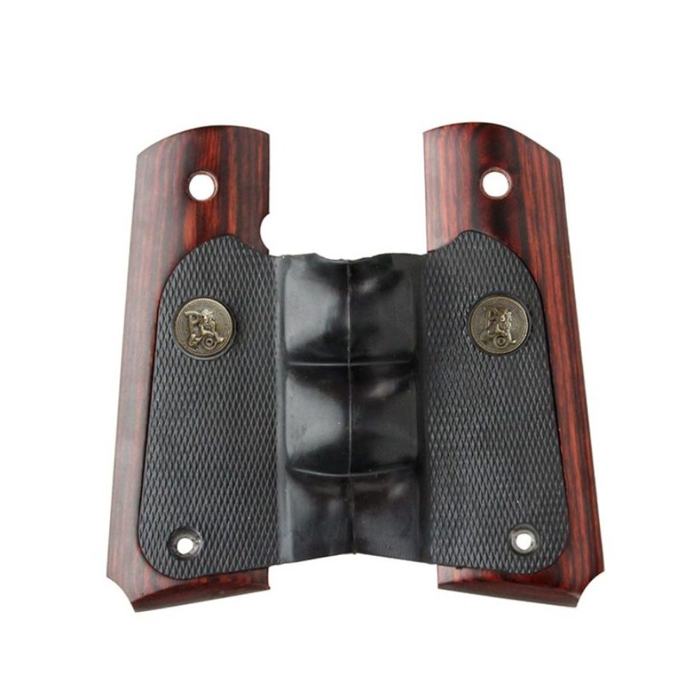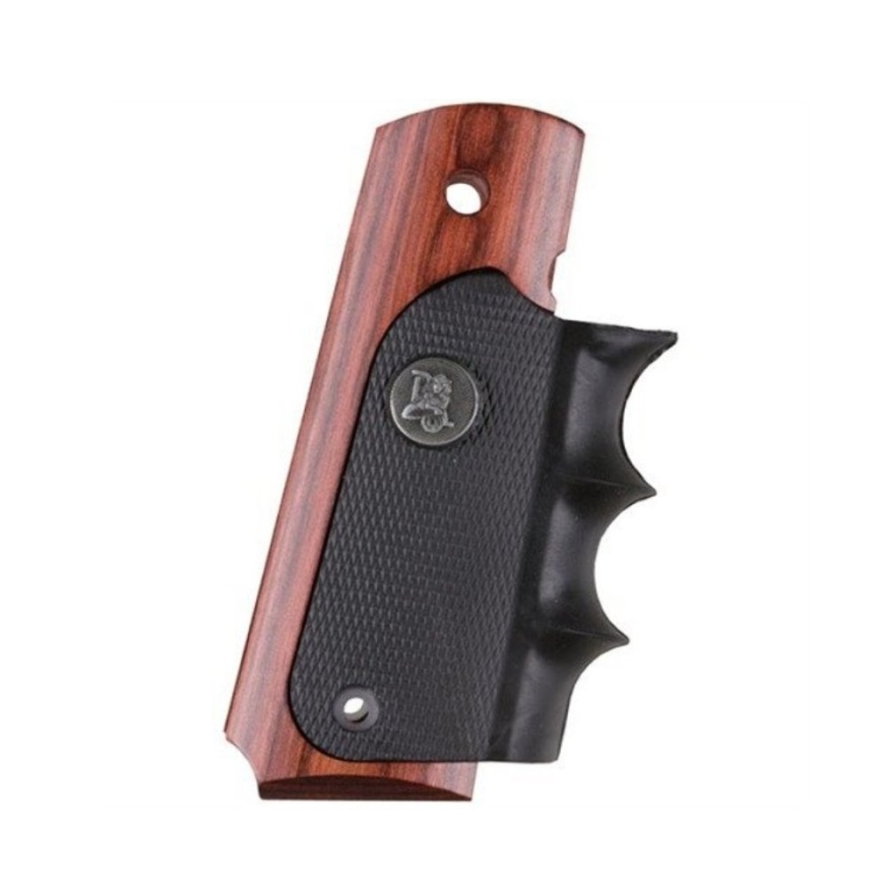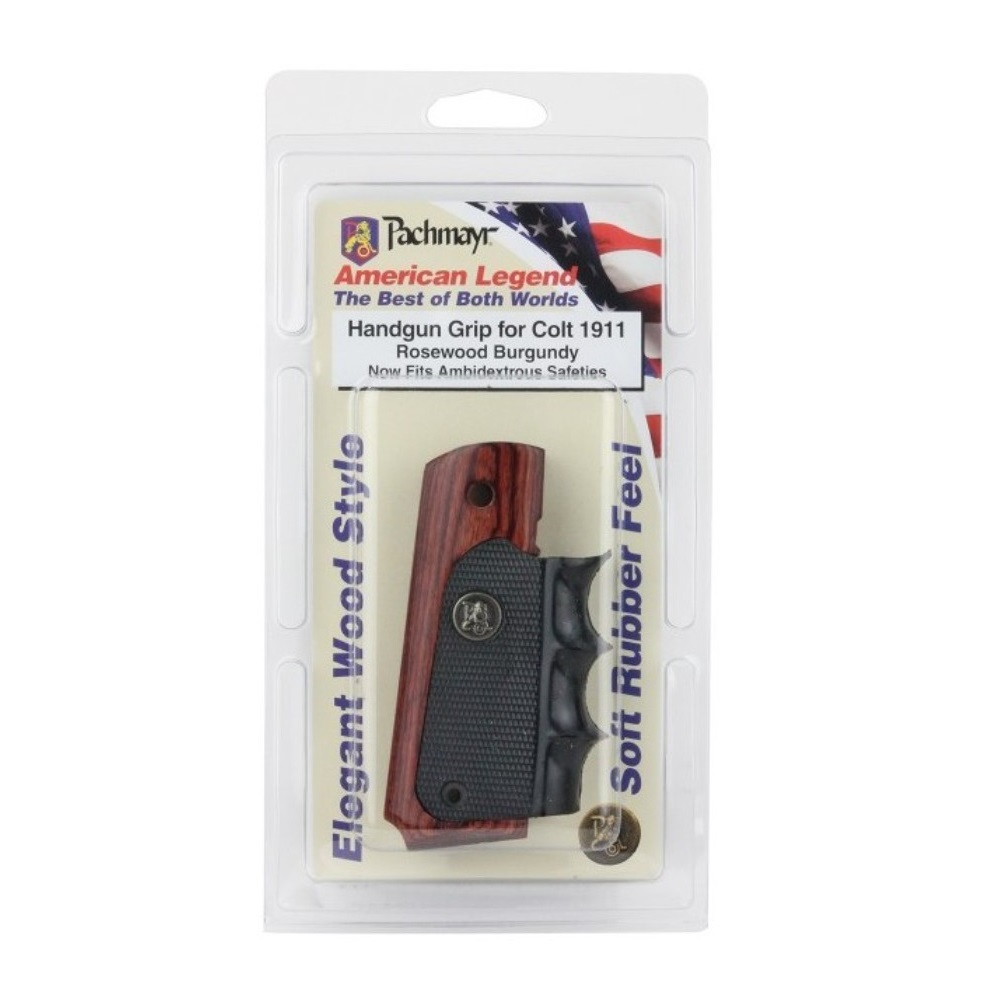 With proven recoil absorbing rubber panels, comfortable finger grooves and attractive wood trim, Pachmayrs popular American Legend Grips now offer a range of colors. Choose Rosewood, Charcoal Silvertone, or Heritage Walnut laminate. Each semi auto grip features the popular American Legend wraparound design with relief cuts for ambidextrous safeties and mainspring housing pin cut-out. Whether for blued, stainless or any finish, these American Legend Semi-Auto Grips will enhance the looks and handling of your Colt 1911 today.