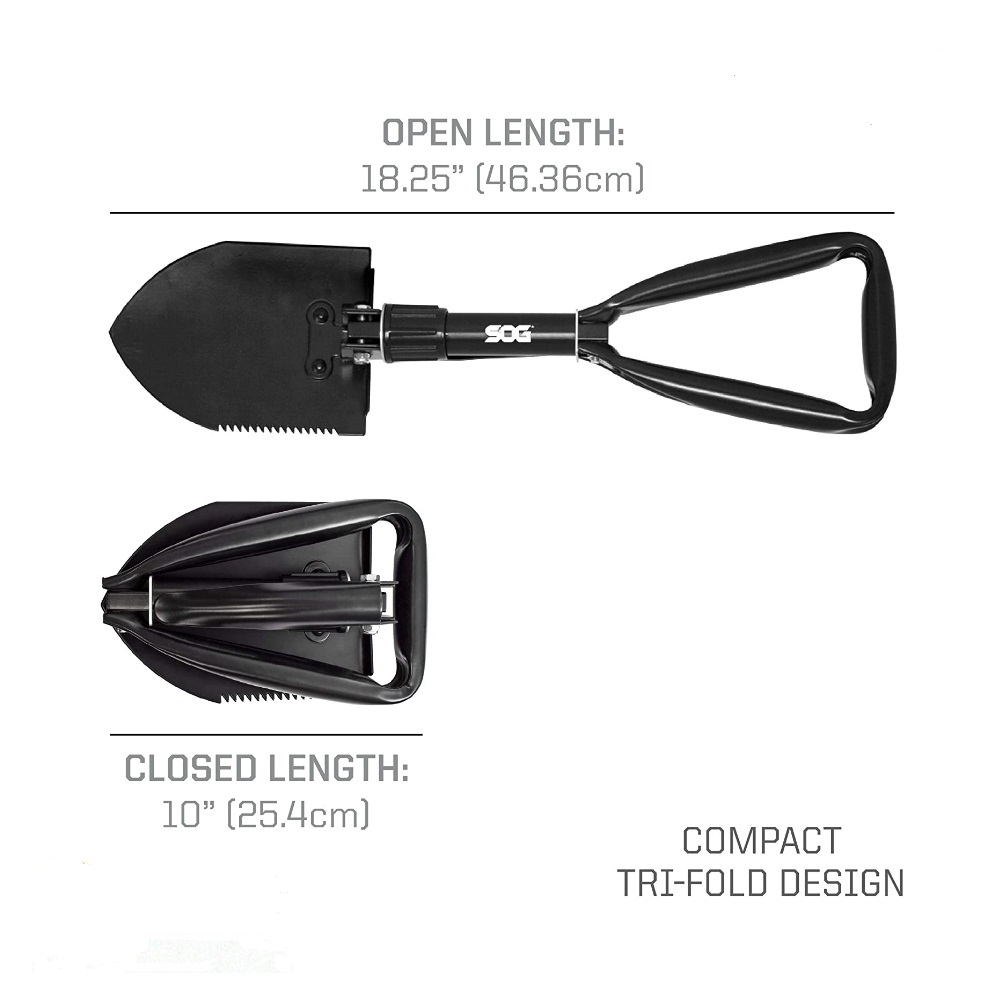 The Entrenching Tool is crafted with black powder-coated high carbon steel, offering you a resilient and versatile entrenching tool to handle the job at hand. Entrenching tools are designed to move heavy loads and take a good kicking while doing it. SOG uses high-quality steel and a rugged build to ensure your Entrenching tool is as portable and powerful as possible.