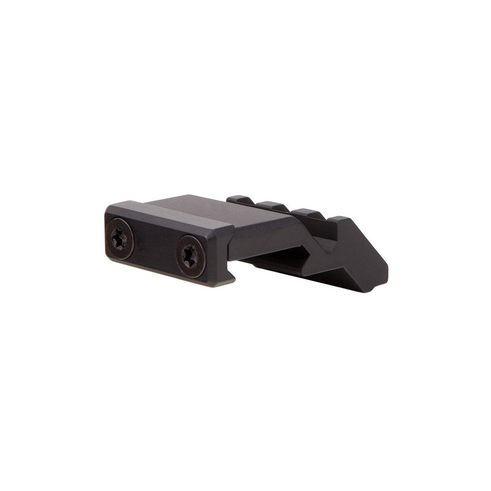This offset rail adapter attaches to the firearm’s picatinny rail and provides a short picatinny rail at a 45° offset to mount a red dot sight.