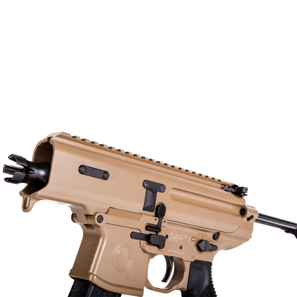 The MPX Copperhead features a monolithic Elite Series Cerakote finish upper receiver, with an integrated stock knuckle lower, and a 3.5 barrel with integrated muzzle brake. The MPX Copperhead comes equipped with the new SIG SAUER Pivoting Contour Brace (PCB) giving pistol users a brace that easily adapts to the movement of the shooters arm with a patented swivel operation for perfect placement, and can be rapidly deployed.